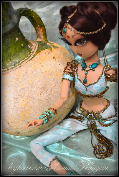 Мохини - текстильная кукла, тело - сатин, набита синтепухом, волосы - волокна крапивы, лицо расписано акриловыми красками, кисти рук и ступни ног - запекаемая полимерная глина, ручная лепка. Одежда - шифон, атлас, бисер, стеклярус, натуральная бирюза,стекло, металлическая фурнитура.